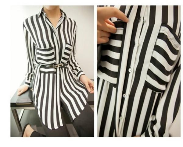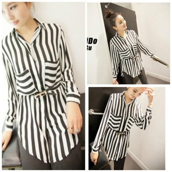 ストライプウエスト絞り 長袖 スリム シフォンシャツブラウス ロング丈