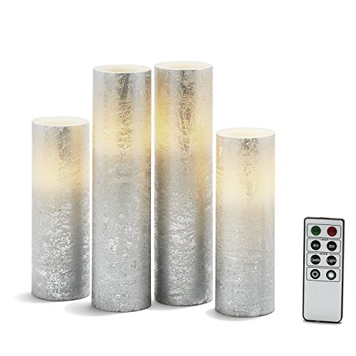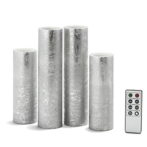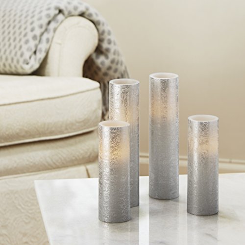 ✓ VERSATILE - Set of 4 Silver Distressed Flat Top Slim Pillar Candles with 1 Warm White LED in each. These candles are a beautiful touch of light to any party, window, mantle, or wedding table. Great for Christmas too, these candles are a great gift or decorating prop during the holiday season.