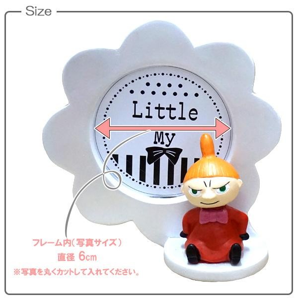 お花型のフォトフレームの前にリトルミイがちょこんと座っています。リトルミイのトレードマークのおだんご頭にふれると、ゆらゆら~♪ゆらゆら~♪