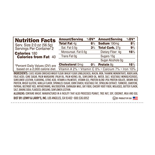 Studio : LENNY LARRY'S Publisher : LENNY LARRY'S Binding : Health and Beauty Product Description Best Tasting, Vegan, High Protein, No Dairy, No Eggs, Non GMO, Good Source of Fiber, No Cholesterol, No Trans Fat, Nothing Artificial, No Sugar Alcohols, No High Fructose Corn Syrup, Kosher. 0