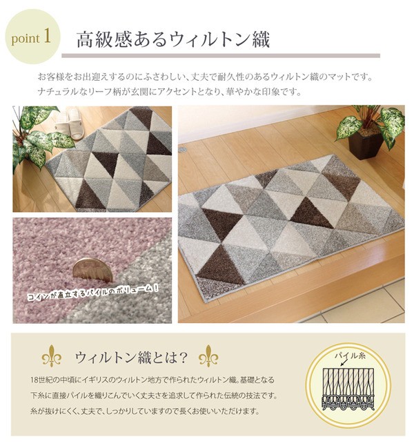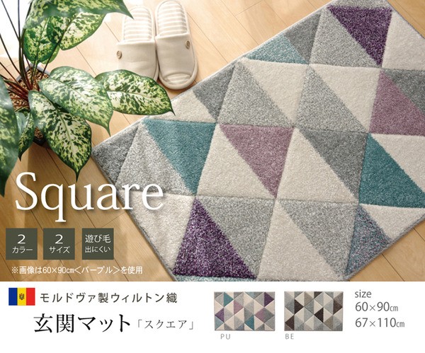 【商品名】 玄関マット 抗菌防臭 『スクエア』 ベージュ 約67×110cm 【ジャンル・特徴】 玄関用ラグマット シート ■サイズ・色違い・関連商品■約60×90cm ベージュ■約60×90cm パープル■約67×110cm ベージュ[当ページ]■約67×110cm パープル関連商品の検索結果一覧はこちら モルドバ製のウィルトン商品です。本商品のパイル部分にはポリプロピレン素材を使用しております。ポリプロピレンはヘタリにくく、耐久性に優れ、繊維の中でも軽い素材です。また、汚れが付着しにくく、遊び毛や毛玉が非常に出にくいという特徴もあります。鮮やかな色味とシンプルな幾何柄のデザインが特徴です。■商品スペック【サイズ】約67×110cm【素材】パイル部=ポリプロピレン100%【洗濯表示】洗えません。【原産国】モルドバ製【配送日時指定について】・この商品は、配送希望日と時間帯をご指定可能です。・配送希望日は出荷目安(最長)の 2 - 30 日後の間でご指定ください。・最短でのお届けをご希望の場合は「指定なし」を選択してください。※配送エリア(例:沖縄・離島)により、配送希望日のご指定をお