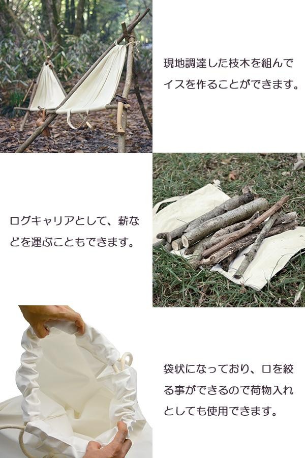 この布一枚でキャンプがより楽しめる♪二辺に肩紐があるので、枝木を運ぶことができたり、現地調達した枝木を組んでイスにしたり、布は巾着型で荷物入れにと使い方によってさまざまです!! |