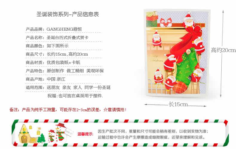 【Name】 Hong Kong Heng Christmas decorations 20x15cm three-folded three-dimensional Christmas card cartoon card wishing card 32g