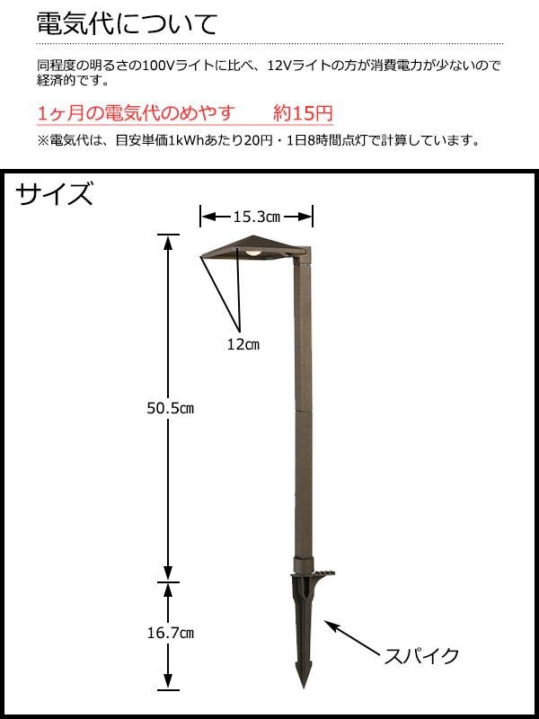 | 仕様 | 3WLED 色温度:3000K(電球色) 全光束:230ルーメン 電圧:12V 定格寿命:約40000時間 ブラウン色 防雨型 LED交換不可 専用トランス及びケーブルが別途必要 メーカー指定以外の電源トランスは使用不可 |