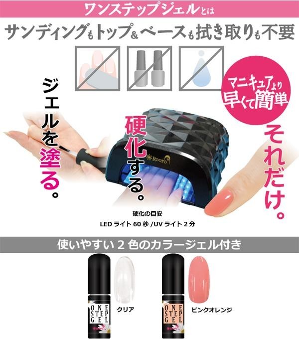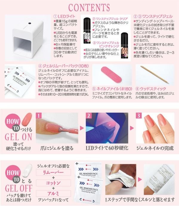 | セット内容 | ワンステップジェル(クリア)×1、ワンステップジェル(ピンクオレンジ)×1、超コンパクトLEDライト×1、ジェルリムーバーパック(10枚入)×1、ファイル(180)×1、ウッドスティック×1、ジェルキット説明書、ライト保証書(保証期間:6ヶ月) |