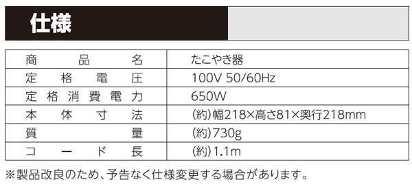 fk094igrjsたこやきが18個焼けるたこやき器ですフッ素樹脂加工プレート使用でお手入れも楽々ですサイズ個装サイズ:22×9×23cm重量個装重量:830g仕様保証期間:1年間製造国中国卓上で簡単にたこやきパーティーができますたこやきが18個焼けるたこやき器ですフッ素樹脂加工プレート使用でお手入れも楽々です
