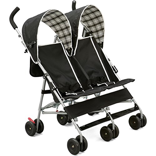 Studio : Delta Children Publisher : Delta Children Binding : Wireless Phone Accessory Product Description Introduce your little ones to the great outdoors in style with the Delta Double Side by Side Stroller in black and white plaid. This stroller, with the functionality it offers is a must-have for parents who travel often. This double side by side stroller will be of great use if you have two kids or twins. The baby stroller is ideal for babies weighing up to 35 pounds. The lightweight frame makes it easy to carry around and the 360-degree shock absorbing front wheels improve maneuverability. This lightweight double stroller has a black and white plaid design and a three-point safety harness that keeps your baby in place. The parent cup holder and the two large storage bags at the back of the stroller are great for storing items when you are on the go. This double side-by-side stroller also features a large European style canopy that will protect your babies from sun and rain. 0