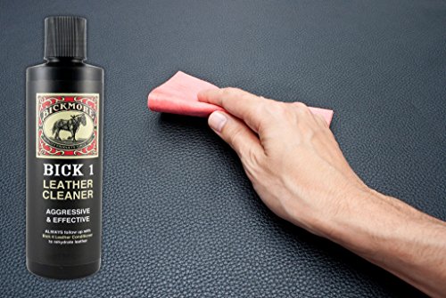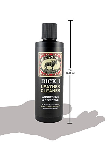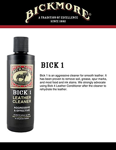 -. Feature : 8 oz (236 ml) bottle / An aggressive and effective leather cleaner / Removes soil, grease, spur marks, and stains / Safe on all leather products / Works best before using Bick 4 Leather Conditioner