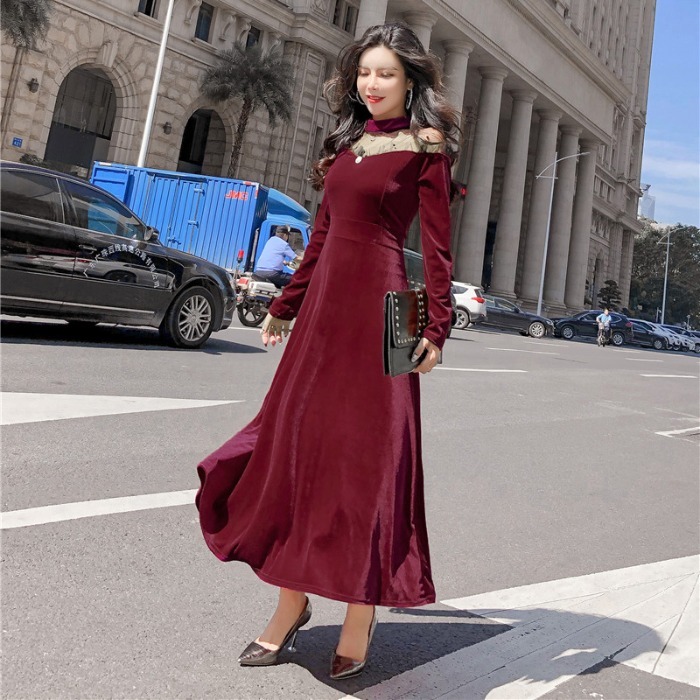 ドットシースルー オフショルダー風 フレア ワンピースドレス レース ホルタ―ネック ハイネック フレア袖 お呼ばれ パーティー エレガント 大人女子