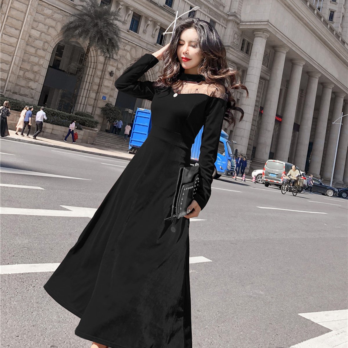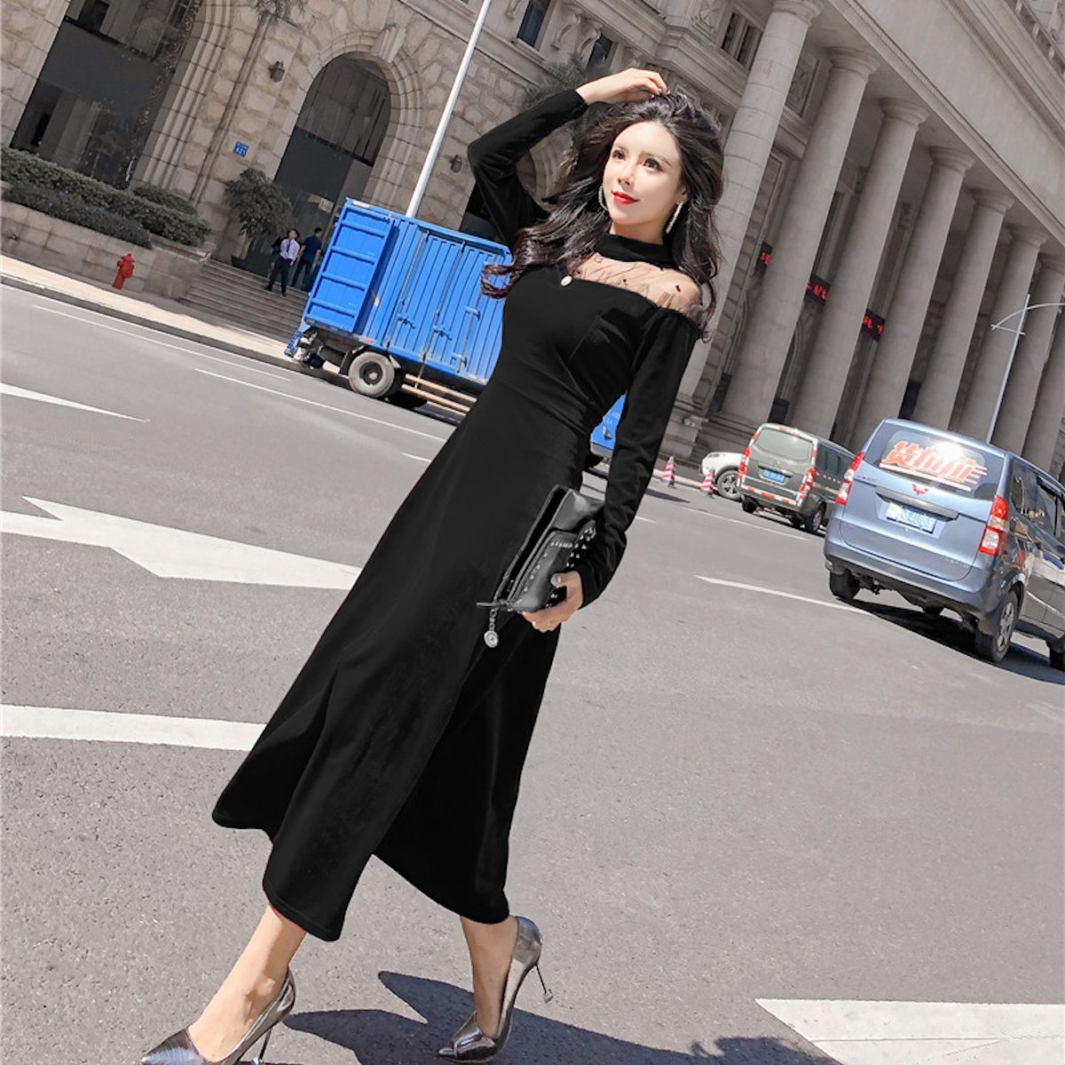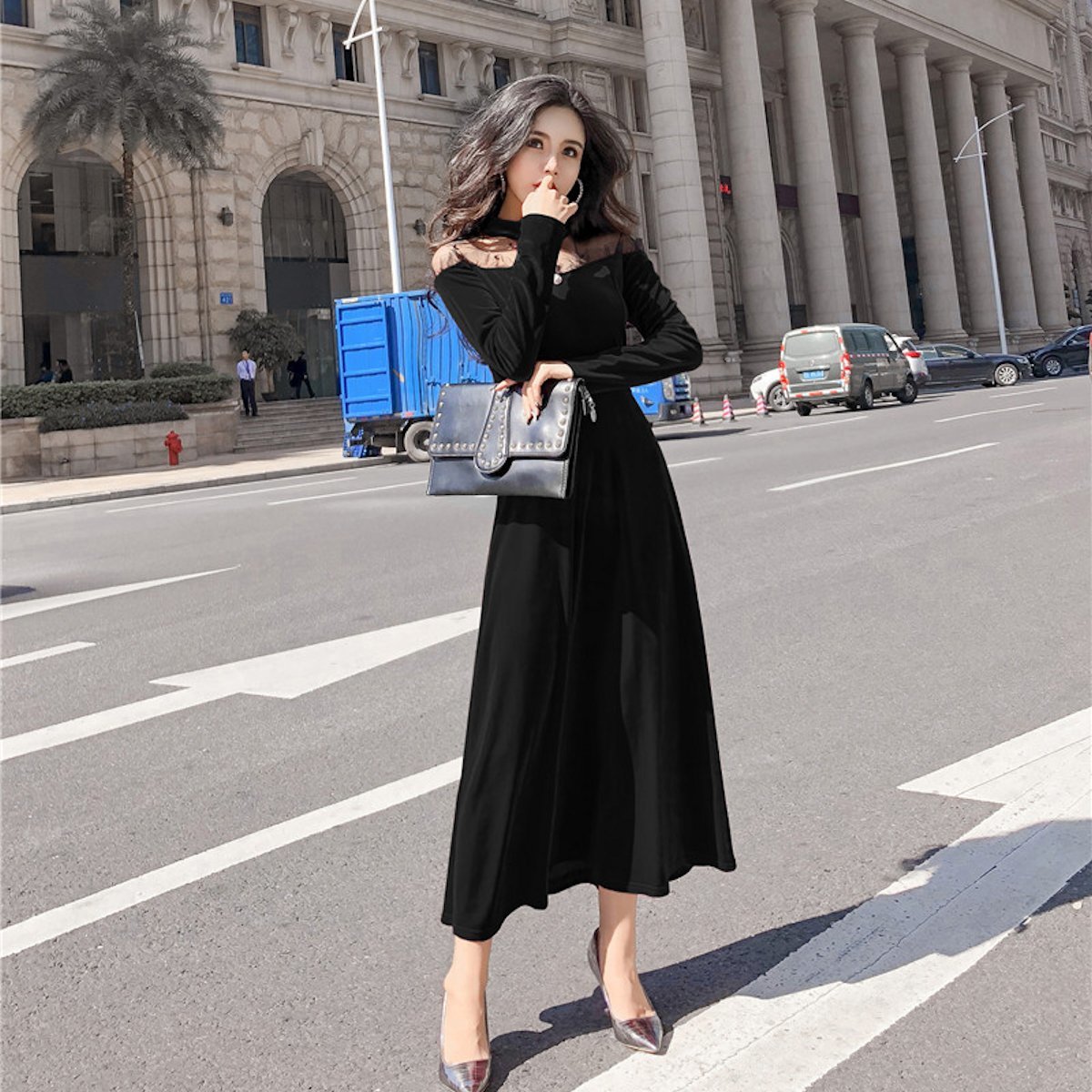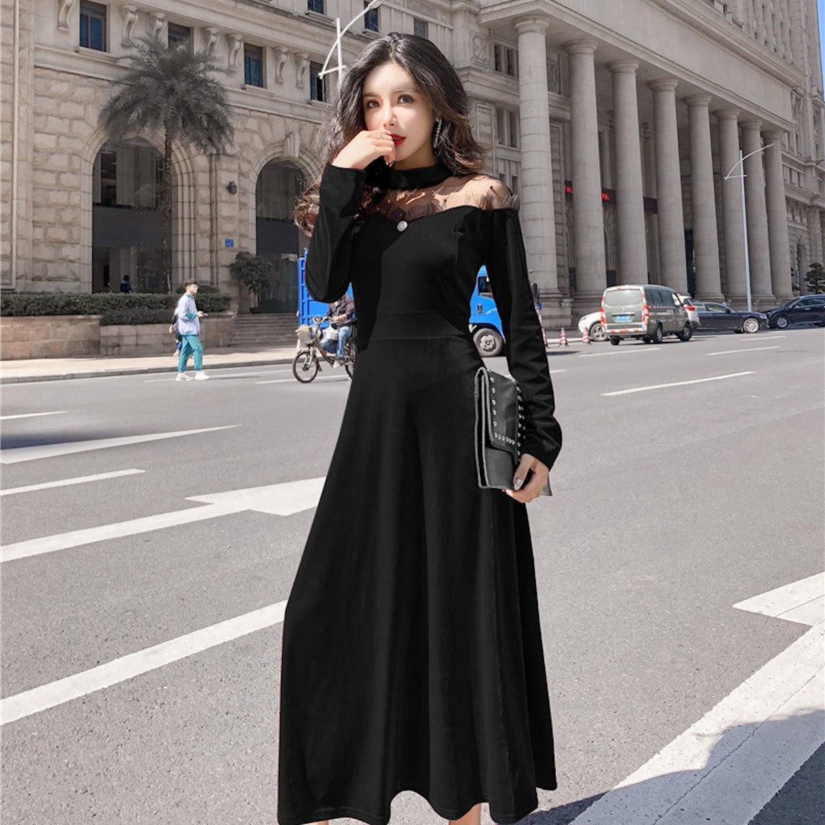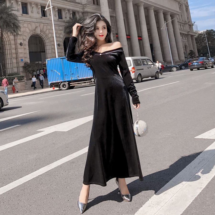 ドット柄シースルーオフショルダーが大人セクシーなフレアワンピースドレス。