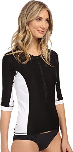 Binding : Misc. Product Description Rashguard with colorblock styling. Round neckline. Half zip at front. Elbow-length sleeves. Straight hem. Shell: 84% nylon, 16% spandex; Contrast: 85% polyester, 15% spandex; Lining: 83% nylon, 17% spandex. Hand wash cold, line dry. Imported. Bikini bottom is not included. If you're not fully satisfied with your purchase, you are welcome to return any unworn and unwashed items with tags intact and original packaging included. 0