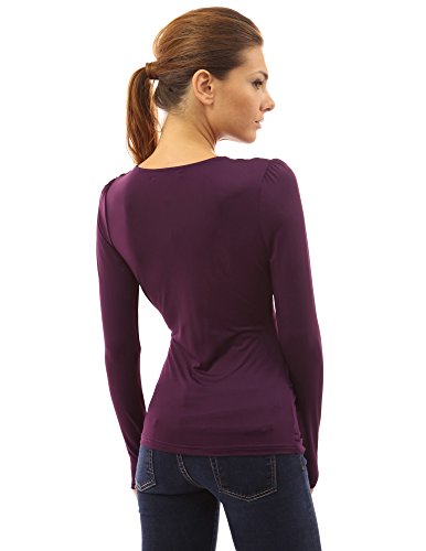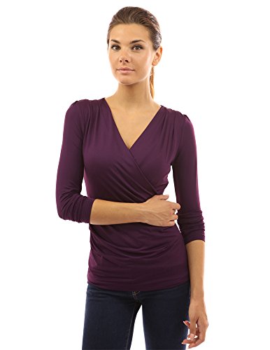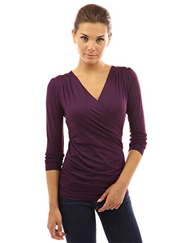 Ruched V Neck Crossover Faux Wrap Long Sleeve Pullover Blouse Top. Model in pictures is 5 feet 8 inches (173cm) tall.