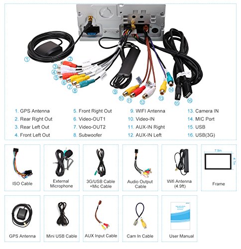 - ★ Package: 1x ISO cable, 1x external mic, 1x 3G/USB cable, 1x audio output cable, 1x wifi antenna (4.9ft), 1x GPS antenna, 1x mini USB cable, 1x AUX input cable, 1x cam in cable, 1x User manual