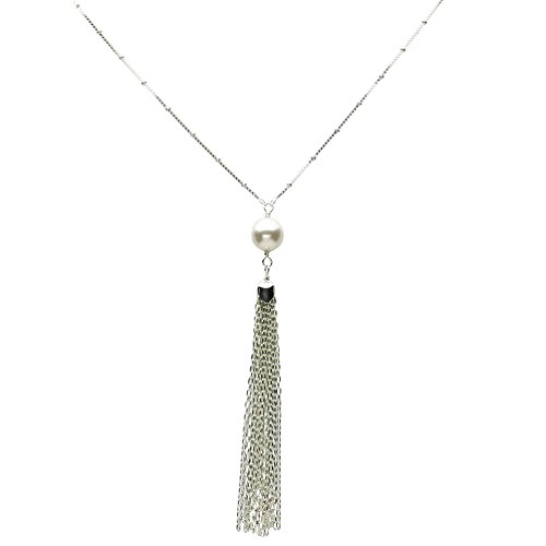 10mm (3/8 inch) Swarovski crystal simulated pearl tops the sterling silver cable chain tassel. Tassel hangs approx 3 3/4 inches long. The tassel cup is approximately 1/4 inch wide. Box chain necklace, with periodically space sterling silver bead stations, is approx 1.1mm wide and 36 inches long from loop end to clasp end. Metal components are sterling silver. Tassel is not removable. Gift box included, color or style may vary.Feature