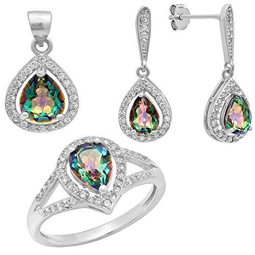 This lovely ring, earring & pendant jewelry set feature rainbow quartz & white cubic zirconia in prong setting. All stones are sparkling and 100% natural. FREE 18 Inch Silver Chain Included. All our products with FREE gift box and 100% Satisfaction guarantee. SKU # RT131Feature