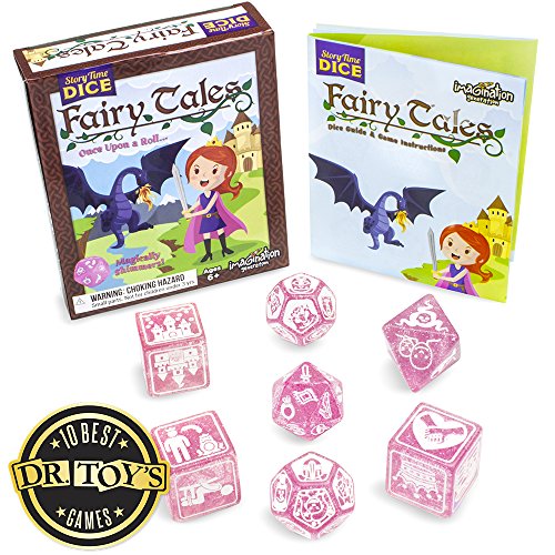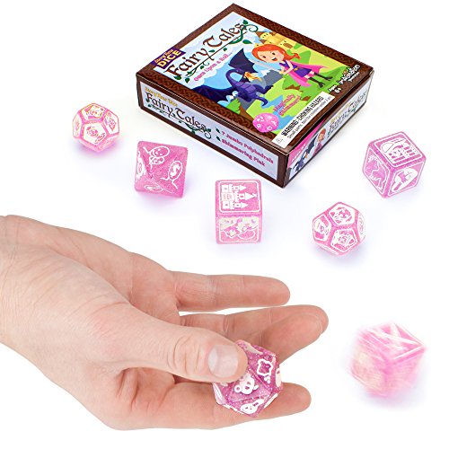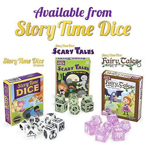 Roll your own "Happily Ever After!" Story Time Dice are back and better than ever! Roll your way into a fantastical world of fairy tales. These seven jumbo polyhedral dice illustrate 70 classic fantasy concepts and shimmer in the sunlight. Join twelve heroes to outwit twelve vile villains across six whimsical settings. Overcome eight obstacles with the help of twenty magic tools, but stay wary of the troublesome twists! Will your "ever after" be happy? The answer is just a roll away! Once Upon a Roll... If you need a little help getting started, every set of Story Time Dice: Fairy tales comes with a handy dice guide with 7 suggested games to play. They range from simple storytelling games for beginners to complex, turn-based party games with lots of rolling. There's even a special crossover game for owners of Story Time Dice and Story Time Dice: Scary Tales! Are you brave enough to play them all? 0