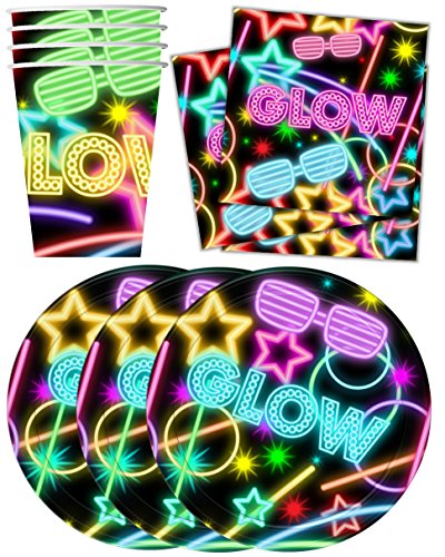 -. Title : Glow Light Neon Birthday Party Supplies Set Plates Napkins Cups Tableware Kit for 16