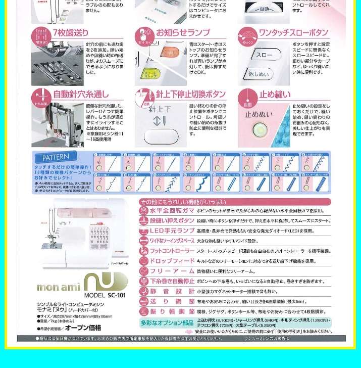 ●付属品:ボビン4個、ドライバー1個、針板用ドライバー1個、糸巻き押え1個、針(5本入り)、シームリッパー1個、ジグザグ押え1個(ミシン本体に付いています。)、ボタンホール押え1個、ふちかがり押え1個、まつりぬい押え1個、ファスナー押え1個、フットコントローラー1個、ハードケース、取扱説明書1冊