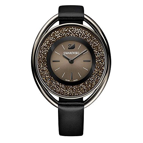 Add a glamorous sparkle to your wrist with this innovative Swarovski timepiece. It features a unique oval case for a sleek look. Specifications: case - oval dark gray-tone coated stainless steel outer ring, inner ring filled with approximately 1'700 metallic light golden-tone crystals, 37 x 43mm; dial - dark gray sunray with black index markers at 3, 6, and 9 o'clock; strap - black calfskin leather with dark gray ardillon buckle; water resistant; movement - Swiss quartz.Measures 37 x 43 mm / 19 cm