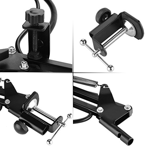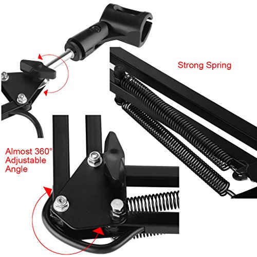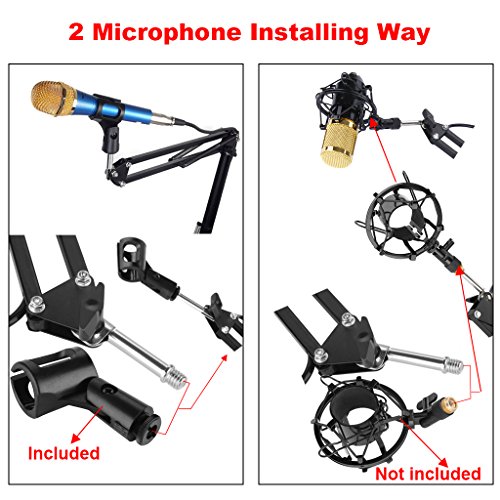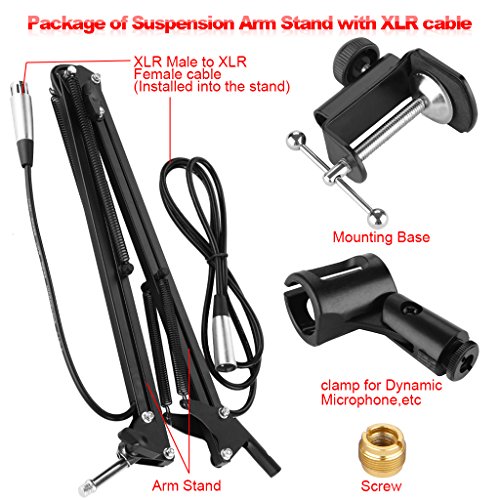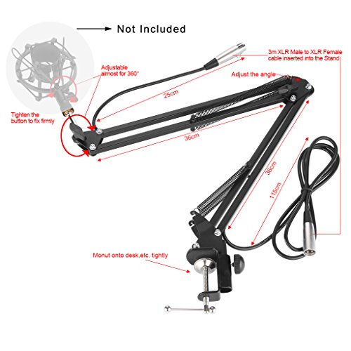 -. Brand : Floureon -. EAN : 0708624045406 -. Feature : Ideal for radio broadcasting studio, voice-over sound studio and so on / Made of all steel construction: Stable, Tough, and Affordable; Can be mounted on the announcers' desk with the metal mounting base: The Mount base can be installed onto the desk up to 55mm thickness. / The double-braced arms add strength. Your microphone can be held safely on this scissor arm microphone mount. With a standard microphone clamp to mount any standard-sized handheld microphone. / The standard microphone clamp can hold the microphone diameter about 27mm. Kindly note: for the large diaphragm condenser microphone, you need to buy an extra Shock Mount to replace the clamp. / The XLR male to female microphone cable is already installed hidden inside the boom arm tubing enhancing the scissor suspension microphone stand's overall appearance. -. Label : Floureon -. Manufacturer : Floureon -. MPN : 108978601-01 -. PackageQuantity : 1 -. PartNumber : 108978601-01 -. ProductGroup : Musical Instruments -. ProductTypeName : SOUND_AND_RECORDING_EQUIPMENT -. Publisher : Floureon -. Studio : Floureon -. Title : Floureon Broadcast Studio Microphone Suspension Boom Scissor Arm Stand with XLR Male to Female Cable(Black) -. UPC : 708624045406