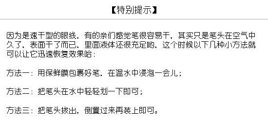 【特别提示】因为是速干型的眼线,有的亲们感觉笔很容易干,其实只是笔头在空气中久了,表面干了而已,里面液体还很充足哟,这个时候以下几种小方法就可以让它迅速恢复效果哈: