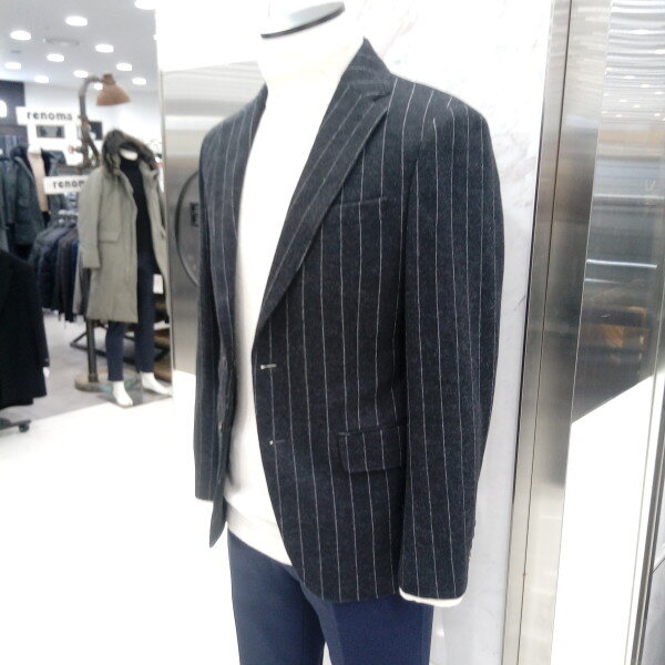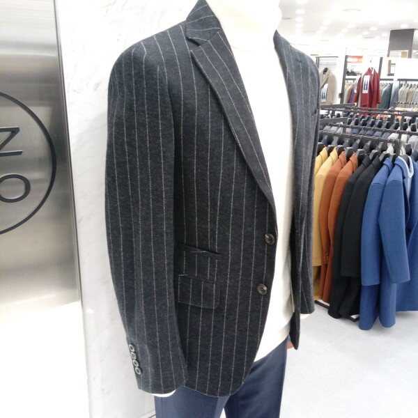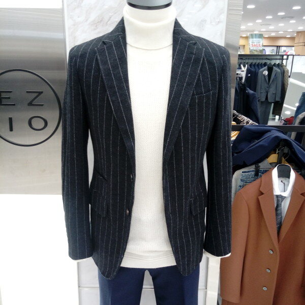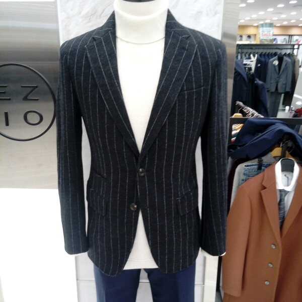 핏감이 좋은 모 혼방 다크그레이 스트라이프 슬림자켓입니다