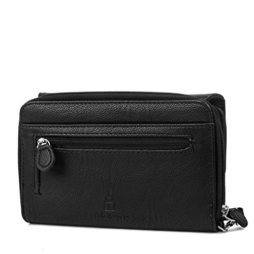 THREE SEPARATE ZIPPER POCKETS - One large top zip around accordion pocket opens to 3 interior compartments with two large pockets and an additional interior zipper pocket. Plus an exterior zipper pocket typically used as a change purse.
