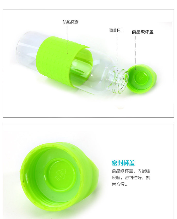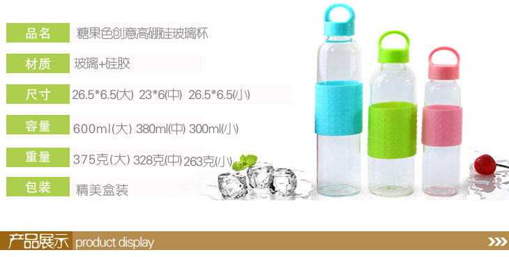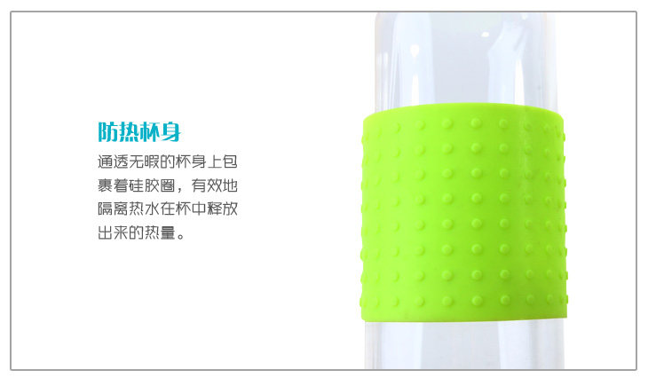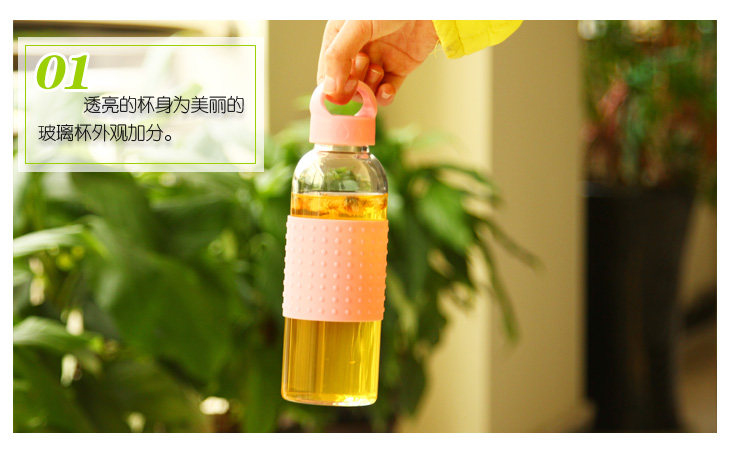 | Product Description | Delicate glass, petite cup body, fashionable, transparent flawless body wrapped cup silicone ring, effectively isolate the heat released from the hot water in the cup. Smooth inner walls, the smell of small, easy to clean, non-organic chemicals, non-toxic, environmental health. When the glass containing various liquids, do not worry about chemical substances will be drinking into the stomach for a long time do not leave drinks containing hard to wash the dirt. When embedded in a stylish hand-tighten the lid sealing gasket, make sure the content liquid, do not worry about its side or upside down spill, easy to carry out. |