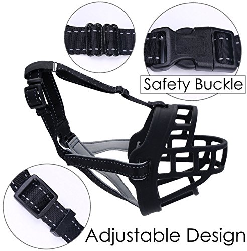 Details Brand: Barkless Type: Soft Basket Dog Muzzle Material: Silicone Rubber and nylon Colors available:Black Size Guide: Size 1: Snout 7-8"(18-21cm), Support /3.3-11 lbs(1.5-5kg)Breeds Size 2: Snout 8-10"(21-26cm),Support/8.8-27.5 lbs(4-12.5kg) Breeds Size 3: Snout 10-12"(26-30cm),Support 22-55 lbs(10-25kg)Breeds Size 4: Snout 12-13.5"(30-34cm),Support/49.6-82.6 lbs(22.5-37.5kg) Breeds Size 5: Snout 13.5-14.5"(34-37cm),Support/82.6-121 lbs(37.5-55kg) Breeds Size 6: Snout 15-17"(38-43cm),Support/121-154 lbs(50-70kg)Breeds