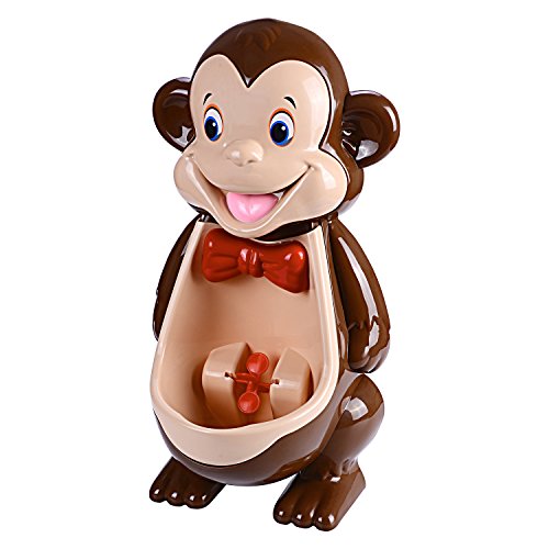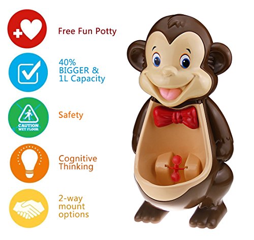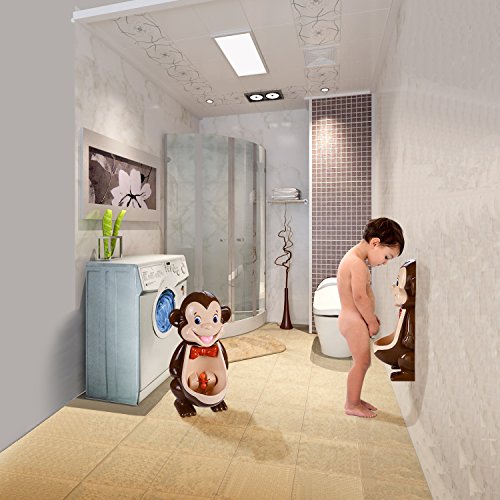 Feature Potty training can be fun. The mkool new generation boys cute monkey potty training urinal is designed to encourage and motivate our little man towards getting potty trained. The fun spinning water wheel entertains and keeps your child focused during training. The removable urinal is lightweight, portable and easy to clean.The adhesive wall hooks to allow you to adjust the height of the urinal and attached it to any bathroom walls. It is made of high quality PP and PVC material. It is environmental friendly,non-toxic and odorless.