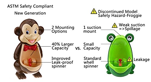 Product Details Our new generation of monkey urinals strictly checks the quality and makes many corrections. Our concern was on user¡?s safety and risk of fall/injury. The new monkey potty is now made more larger and an improved water spinner that is 100% leak proof. Its smooth curvature bowl is also designed to better contain urine splash. Unlike the other potty that relies solely on its suction-type wall mount; causing spillage whenever its suctions fail. The adhesive wall hooks to allow you to adjust the height of the urinal and attached it to any bathroom walls. Very solid! Additional base supports also allow users to stand Wallie on the floor where preferred.