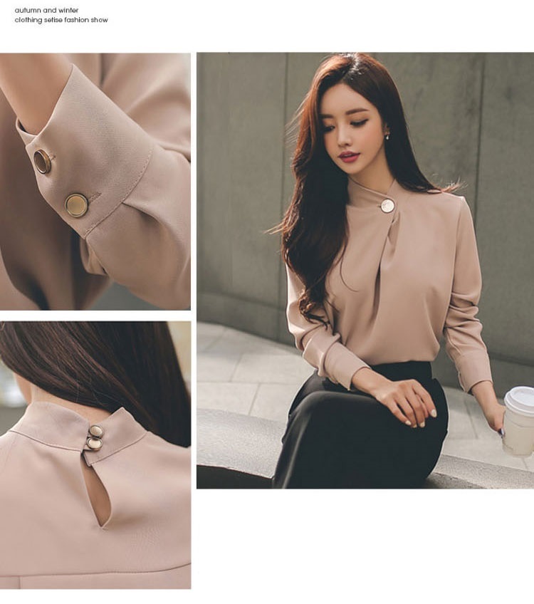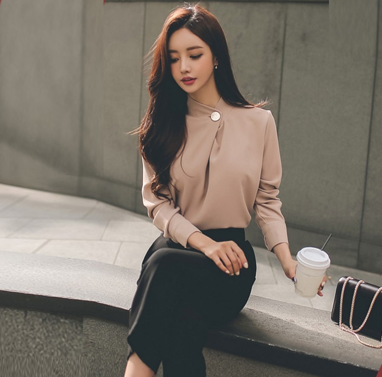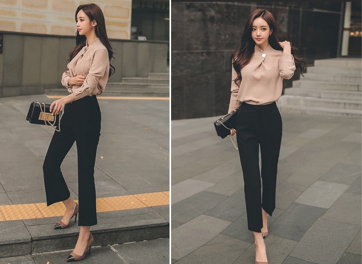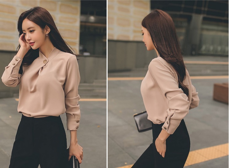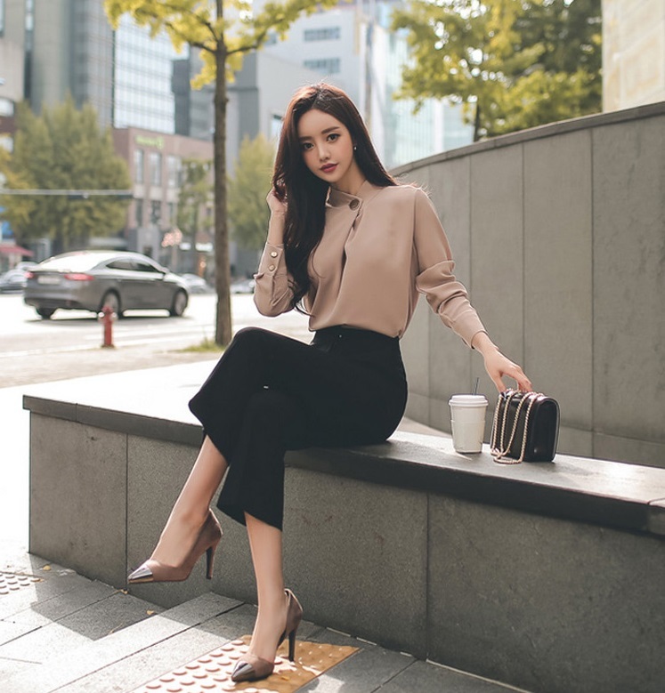 トップスのボタン使いがアクセントとなるブラウスで、女性らしさもプラス。
