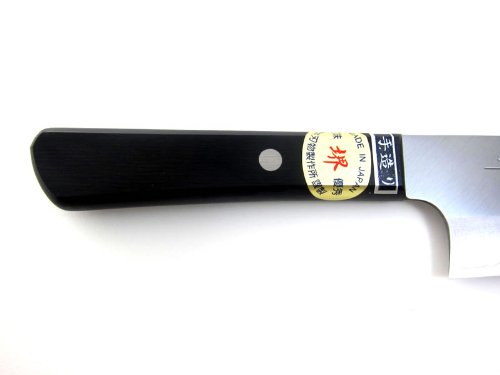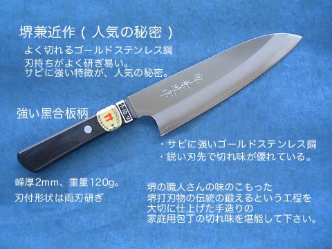 사카이시의 후지 칼날 제작소로 제조되고, 많은 가정에 이용되어 있습니다. 문화 부엌칼165mm입니다.가정용으로는 인기의 스테인레스강의 겸근 문화 부엌칼입니다.녹에 강하고 칼이 드는 정도도 좋고, 인떡도 좋으면 평판 사카이인 직공(직인)씨의 맛이 깃든 사카이타 칼날의 전통이 단련하는 이라고 하는 공정에서 잘 마무리한 손 만드는 가정용 부엌칼의 칼이 드는 정도를 만끽해 하십시오.