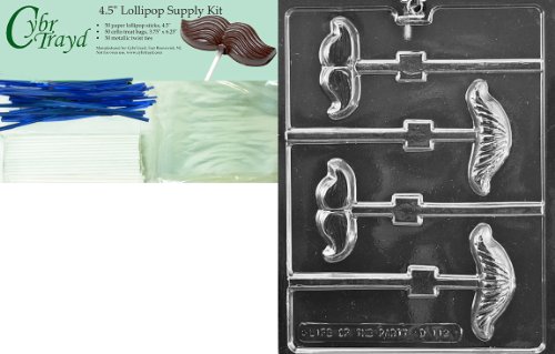 Cybrtrayd "Mustache Assortment Lolly" Dads Chocolate Candy Mold with Lollipop Supply Bundle, Includes 50 Lollipop Sticks, 50 Cello Bags and 50 Blue Twist Ties
