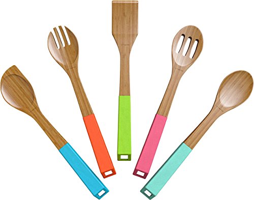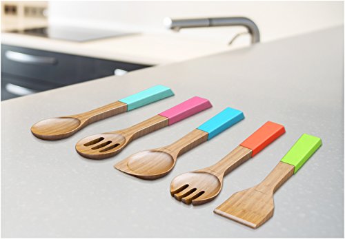 Title : Vremi 5 Piece Bamboo Wooden Spoon and Utensils Set - Natural Eco Friendly Kitchen Basics - Spatula Forked Serving and Mixing Spoons with Hanging Storage Holes and Colorful Silicone Ergonomic Handles