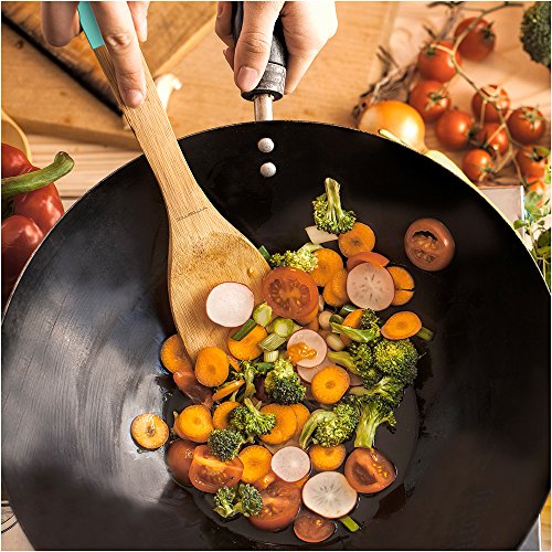 Feature : Wooden bamboo spoon set includes spatula, slotted spoon, serving fork, serving spoon and mixing spoon / Natural bamboo spoon heads, colorful silicone handles and natural oil finish / Handles have built-in holes for hanging storage and decorative display / Bamboo utensils are safe to use with non stick cookware / Hand wash utensils with warm, soapy water