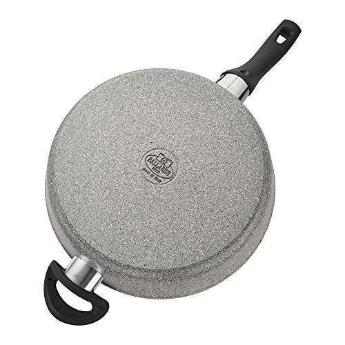 Made in Italy, Ballarini Parma infuses the rich tradition of Italian cuisine into easy-to-use pans for everyday cooking. The revolutionary speckled Granitium nonstick coating boasts quick release for effortless cooking. Appealing to the eye, this ultra durable coating has a heart of stone—it is fork-proof, metal-safe and extremely scratch-resistant, increasing the lifespan of your pan. The easy-to-clean surface ensures that no time is wasted on washing and more time can be spent on cooking. Ballerina's innovative heat-sensitive handle turns red when hot and green when cool. This lets you know when the pan's temperature is just right for cooking—preventing unnecessary overheating or undercooking—and properly cooled off for cleaning. Made from the most pure aluminum in the industry, the fry pan's cold forged body heats up rapidly and evenly with no hot spots. Three times more energy efficient than cast iron, aluminum is also wonderfully light, eliminating any arm strain. The ergonomic, stay cool handle offers a comfortable grip for maximum control. With Ballarini, experience the ease of nonstick expertise.Feature