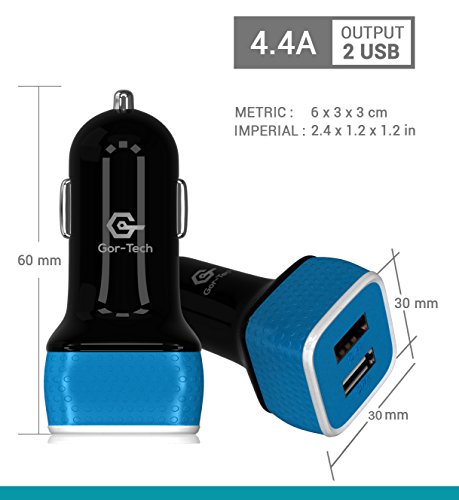 -. Title : Dual Port USB Car Charger (4.4A) by Gor-Tech - Best for iPhone 6s (plus), 5(s,c), 4(s), 3(gs) and Samsung Galaxy S6 (edge), S5, S4, S3, Note 1-5 (Edge), Nexus 4-6, Motorola Moto (G/X), iPad 1- 4 gen, iPad Air, Tab s 4/3/7.0/8.0/8.4/10.1/10.5 - Portable High Speed External Battery Pack Charger - works with other Android tablets and smartphones [Black/Blue] - 1 year manufacturer warrantee + 30 day money back guarantee