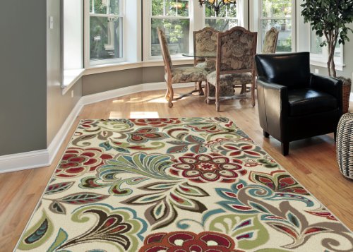 Botanical elements combine to create a tropical flair in this flirty transitional area rug. This design will add a punch of color to various design modes, from traditional to contemporary. Snowy ivory background with cranberry red, espresso brown, pear green, ecru gold, mushroom taupe, teal blue and russet. Options include rounds and a three piece set for a coordinated look throughout the home. Machine made of soft polypropylene that is naturally stain-resistant and easy to maintain. Vacuum often on high-pile setting and spot clean when necessary using mild detergent but no bleach.Feature