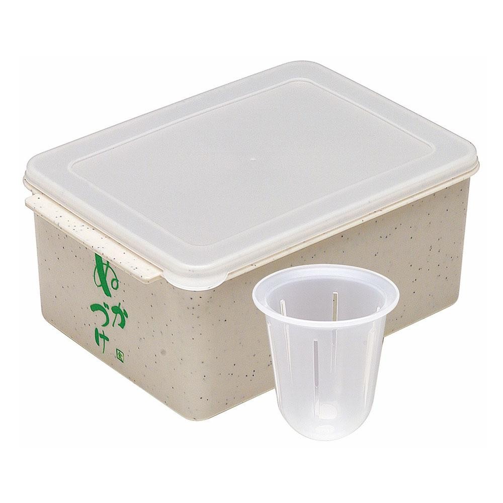 | 自家製ぬか漬け作りにピッタリ!!ぬか床の水分を簡単に取り除ける水取り器と、ぬか漬け用容器のセット。 |