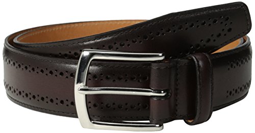 This leather lined stitched edge belt has a polished nickel buckle with single keeper, perfed detail along the edge and is 1 3/8 -inch wide