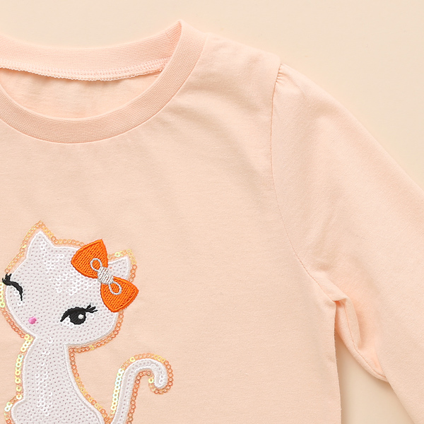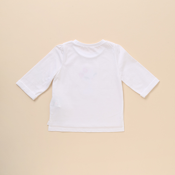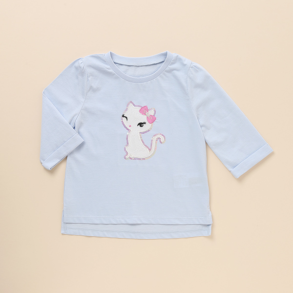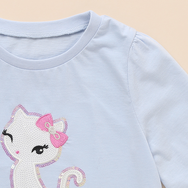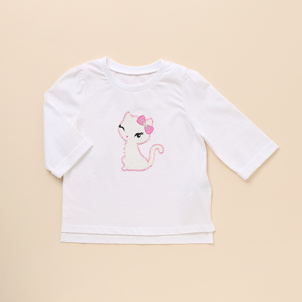 상품설명 소매에 롤업 장식을 해주었고, 옆트임으로 언발기장을 해준 심플라인 7-8부 소매 TS입니다. 깔끔한 화이트에 핑크와 화이트 스팽글로 블링블링한 느낌을 주었고, 리본을 한 고양이로 러블리함을 더해 주었습니다. 심플하고 가볍게 데일리 룩으로 코디하기 좋은 컬러감 예쁜 TS입니다.