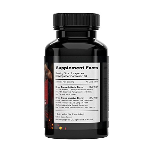 -. Feature : MUSCLE BUILDER - Through powerful and potent ingredients, Brute Gains helps increase muscle mass and strength. Brute Gains works extremely well when it is combined with a good diet and and a normal workout routine. / MALE ENHANCEMENT - The ingredients used in this supplement work at improving the testosterone levels in the body helping users reduce belly fat, gain muscle mass, improve energy levels, increase stamina and sex drive and improve blood flow throughout the body. / TESTOSTERONE BOOSTER - Brute Gains is a dietary supplement designed to increase testosterone levels and promote the production of testosterone. Testosterone is an important hormone for athletes as it helps them perform well at the gym. It is also important for those intending to boost their sexual life. / NATURAL INGREDIENTS - Brute Gains is made in the USA with high end and completely natural ingredients. Containing Fenugreek Seed extract, Tribulus Terrestris, Saw Palmetto, Coleus Foskohlii and Piperine among others, you are getting a completely safe and natural product / WORK OUT BOOST - Brute Gains is specially formulated to give you a boost in the gym while building muscle and reducing fat. The all natural ingredients will help give you an edge in the gym
