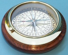 Studio : Brass Binnacle Publisher : Brass Binnacle Binding : Misc. Product Description The Directional Desk Compass is a solid brass reproduction of an antique air-damped compass. The compass needle has long, balanced air paddles mounted perpendicular to the needle to allow stable readings. There is a needle lift thumbscrew to secure the compass needle when transporting the compass. The brass compass is 4 3/4 inches (12.1 cm) in diameter and is mounted on a heavy beautifully-finished solid hardwood base that is 5 1/2 inches (14.0 cm) in diameter and 9/16 inch (1.4 cm) thick. The base has three feet, and the compass and base is 2 inches (5.1 cm) tall and weighs over 1 pound (454 grams). This compass makes a perfect desk accessory for the distinguished office. 0