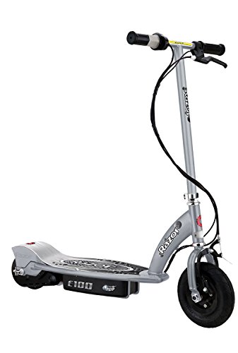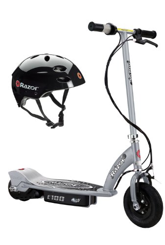 -. Binding : Misc. -. Brand : Razor -. Feature : Powerful fun at speeds of up to 10mph / Short charge time and long battery life / Up to 40 minutes of continuous use / Battery charge time 4-6 hours / Twist Grip Throttle acceleration control -. IsAutographed : 0 -. IsMemorabilia : 0 -. MPN : 13181112 + 97778 -. PartNumber : 13181112 + 97778 -. ProductGroup : Sports -. ProductTypeName : SPORTING_GOODS -. Title : Razor E100 Motorized 24V Electric Scooter (Silver) & Youth Sport Helmet (Black)