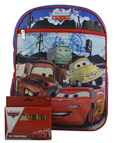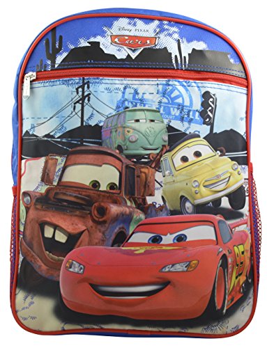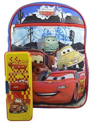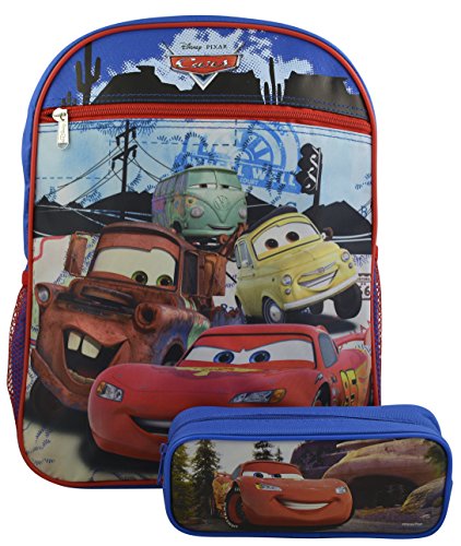 -. Brand : Disney Pixar Cars -. Department : boys -. Feature : Brilliant colors for dazzling school time fun. / Fun design perfect for school and vacations! Well known characters that your child will love having with them. The perfect set all year round! / Features one Main Compartment, one front pocket and two side mesh Pockets. Backpack Dimensions (in inches): 15 x 11 x 4 / Bonus Cars pencil case. / Made of an easy to clean and very durable 100% polyester -. ProductGroup : Apparel -. ProductTypeName : LAGE -. Size : Large -. Title : Disney Pixar Cars Boys' Large 16" Backpack w/ Bonus Cars Pencil Case