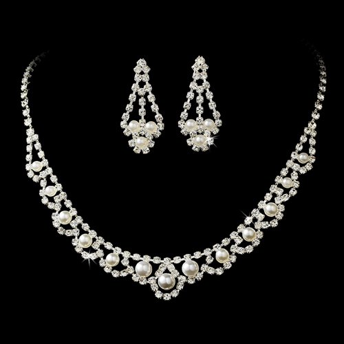 -. Feature : Material: Clear Crystal Rhinestones, White Faux Pearls, Shinny Metal Casting, Silver Plated / Dimensions:Necklace: 15" Long + 3" extension (Lobster Claw Closure); Earrings: Approx. 1.4" Drop x 0.4"W (Post Back Closure) / Color: White, Clear, Silvertone / Nickel / Lead Free