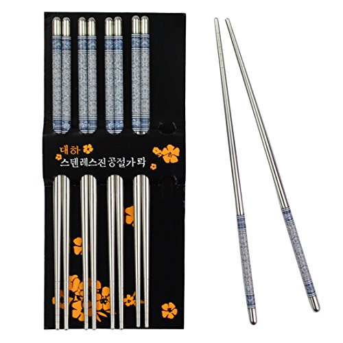 SIZE: The length of our metal steel chopsticks is approx 8.8 inches. The item include 5 pairs which is suitable for family. It's a nice dishware for your daily use to have dinner. Resuable and very environment-friendly for eating Asian food instead of using disposable chopsticks, lightweight and safe for convenient clean up.