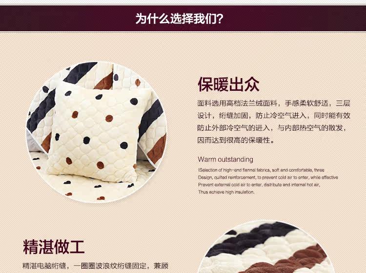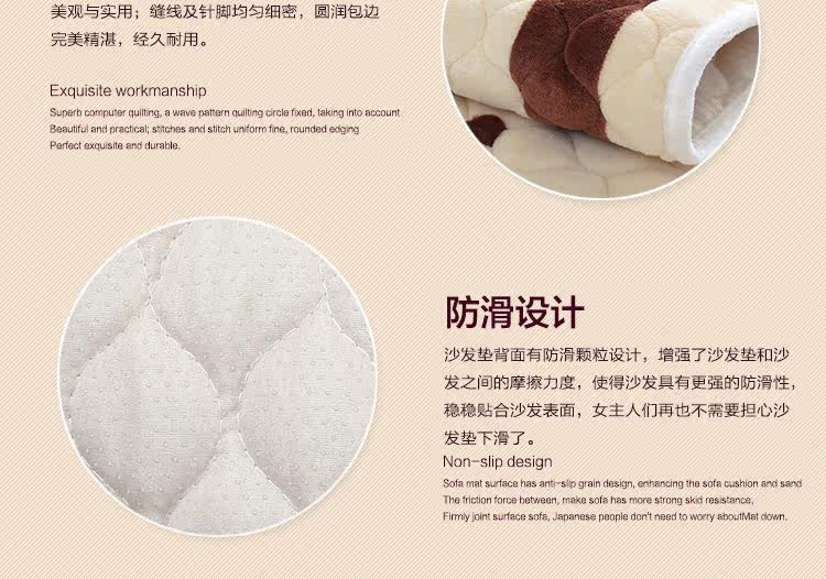 This paragraph flannel sofa cushion fibers more delicate than most businesses use, skin-friendly feel and have a very large increase, using a thick flannel, weight, the higher the sofa cushions will be more compact dense, but also greatly enhance the thermal effect. Reactive dyeing process also makes comfort sofa cushion greatly improved, but also more healthy.