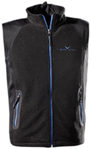 Bequeme und leichte ärmellose Herren Fleeceweste von Black Canyon, bestens geeignet für Spaziergänge, Wanderungen und Trekkingtouren. Das Antipilling Fleece-Material verleiht Ihnen extra Portion Wärme an kühleren Tagen. Sie kann als Isolation unter einer Jacke oder einfach über T-Shirts oder ähnlichem getragen werden. Die Spandex Einsätze an der Seite und die Kordelzüge im Kragen und im Saum garantieren eine optimale Bewegungsfreiheit und einen perfekten Sitz. Der hochgeschlossene Kragen schützt den Hals vor kaltem Wind. Das Gilet verfügt über zwei Seitentaschen jeweils mit Reißverschluss und Zippfinder, so haben Sie genug Platz für kleine Accessoires. Die schwarze Fleeceweste mit blauen Reißverschlüssen ist in den Größen S, M, L, XL und XXL erhältlich.Feature